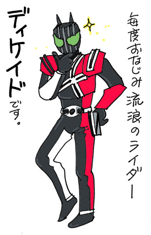友人の亜天が、なんか流浪のライダーディケイドです、とかいうネタを思い付いたので、誰か描かないかなと言っていた。