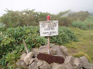 ここからは山頂が見えますが、笹はそこそこ深く、路面が見えないので、杖で笹をかき分けて地面の段差を確認しつつ山頂を目指します。